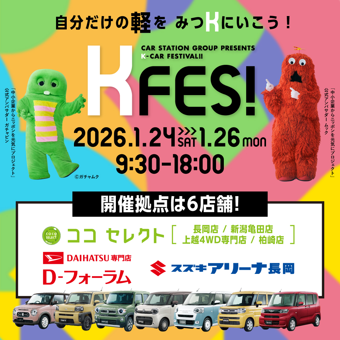 自分だけの軽を見つKに行こう(´艸`*) . 2026年 1月 . 24日(土)・25日(日)・26日の3日間 . KFES!開催いたします☆彡 . 開催拠点は・・・ ・ ・ ココセレクト長岡店 ココセレクト新潟亀田 […]